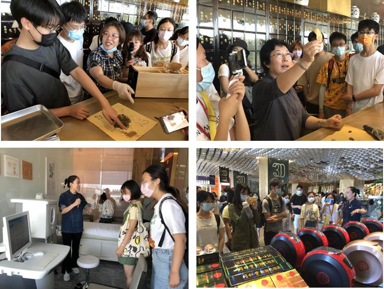 北京同仁堂知嘛健康零号店,拥有全球最大的中药调剂台、亚洲最大的24小时自助售药机、不同类型的亚健康理疗室、近百套亚健康解决方案等,让参与活动的师生体验到了中医药现代产业的变革与飞速发展。同时,中药学院带教老师在现场从色、味、形等多个方面讲解了常用中药饮片的辨识。不少同学们拿起饮片进行嗅闻辨识,或打开中药调剂台查看饮片原始象貌。在实践结束后,师生在一层同仁堂咖啡坊、茶饮坊、烘焙坊、古膳厨房和红酒坊,直接体验了现代中医药衍生产品,以直观的形式感知中医药文化的现代化历程。