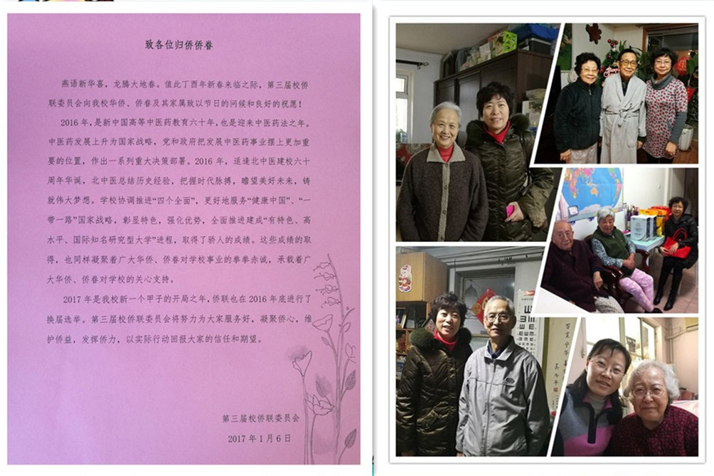 在鸡年新春佳节将要来临之际,校侨联在学校党委及统战部的支持下,对学校的80岁以上归侨、侨眷开展了走访慰问活动。献上慰问信,带上慰问品,并为他们送去学校对他们的关心和节日的问候,向他们表示新春的良好祝愿!