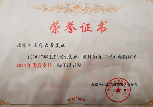 2017年,在学校党委和九三学社朝阳区委领导、组织和帮助下,我校九三支社全体社员深入学习和贯彻党的十九大精神,在努力做好教书育人、科学研究等本职工作的同时,积极发挥民主党派的作用,忠实履行民主党派职责,积极建言献策。刘斌作为朝阳区政协委员,在区政协十三届一次会议上,提交了《加强朝阳区中小学生中医药保健养生文化教育》等提案,并全程参与了《朝阳区基层医疗卫生发展现状及建议》专题调研活动。作为九三学社朝阳区委党派调研《如何实施“文化+”战略》专题组成员,参与完成了调研报告“如何实施‘文化+’战略——‘文化+’的内涵与对实施‘文化+’战略的建议”。2017年3月至5月,王荣国作为主讲教师,完成了传统文化(中医学)进中学项目,并在朝阳区小红门社区卫生服务中心开展社区健康普及讲座。2017年“六一”儿童节,刘斌、杨蕾参加了九三学社朝阳区委组织的赴河北省平山县北冶乡北冶小学捐赠活动。2017年10月,张聪受邀参加了九三学社中央青年工作委员会主办的“九三学社首届京津冀青年论坛”并作为代表发言,为京津冀协同发展及北戴河健康产业发展出谋划策。2017年重阳节,张红林、李侠参加了九三学社朝阳区委和华威北里社区服务站共同组织的社区义诊活动。2017年12月,张保春和王荣国作为世界杯竞猜平台专家团主要成员赴滇西应用技术大学傣医药学院,助力对口支援学术周活动。上述活动多次在九三学社北京市委员会网站、世界杯竞猜平台校园网和九三学社朝阳区委机关报《朝阳九三》上给予了及时报道。
