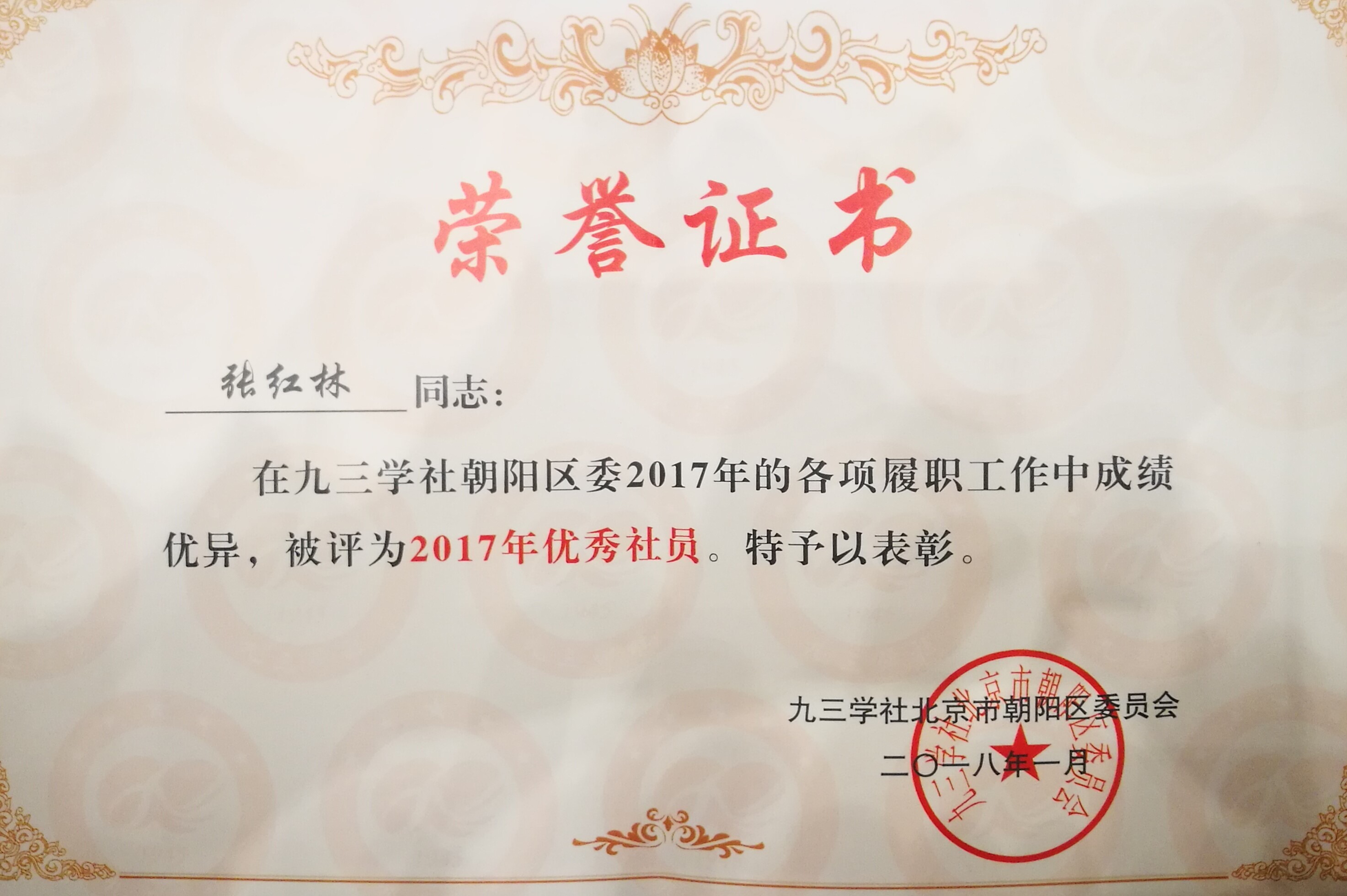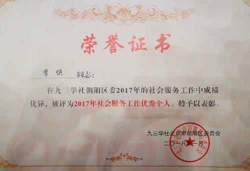2018年1月13日,在九三学社朝阳区委五届八次全体扩大会议上,九三学社世界杯竞猜平台支社被评为优秀支社,张红林被评为优秀社员,李侠被评为社会服务工作优秀个人。