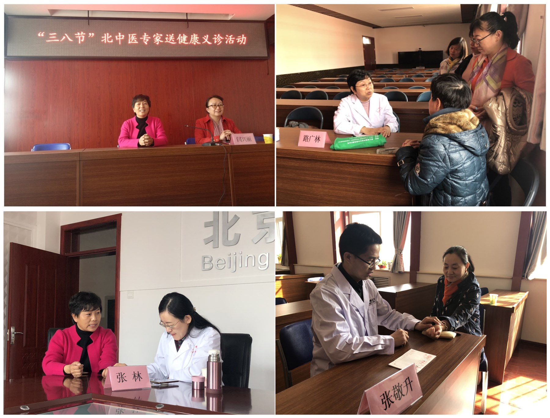 在义诊开始之前,首先举行了一个双方沟通见面会。会上王校长代表全校老师对中医药大学专家表示热烈欢迎,感谢专家们在百忙之中送医上门。我校农工党支部副主委闫兴丽教授代表义诊专家对良乡六中老师们的热烈欢迎表示感谢。她说:随着北中医主校区整体搬迁至良乡校区,北中医师生成了地地道道的良乡镇人,学校与良乡镇中小学共同承担的北京市教委“中医药文化进中小学”共建项目,拉近了北中医与良乡镇中小学的距离,让良乡镇人有更多的机会了解中医药文化,接受中医药医疗服务。农工党支部一直以来坚持为基层医疗服务,每年都会组织多场义诊活动,到良乡六中的送健康活动,也是中医药文化进校园的内容之一。中医学向来以“和”的指导思想调理身心平衡,治病养生,保持健康的重要方面就是要达到身心的和谐与安乐,这与良乡六中提倡的“幸福教育”理念是一致的,所以老师们要积极参与到中医药文化进校园的活动里来,调理身心,幸福健康地工作生活。