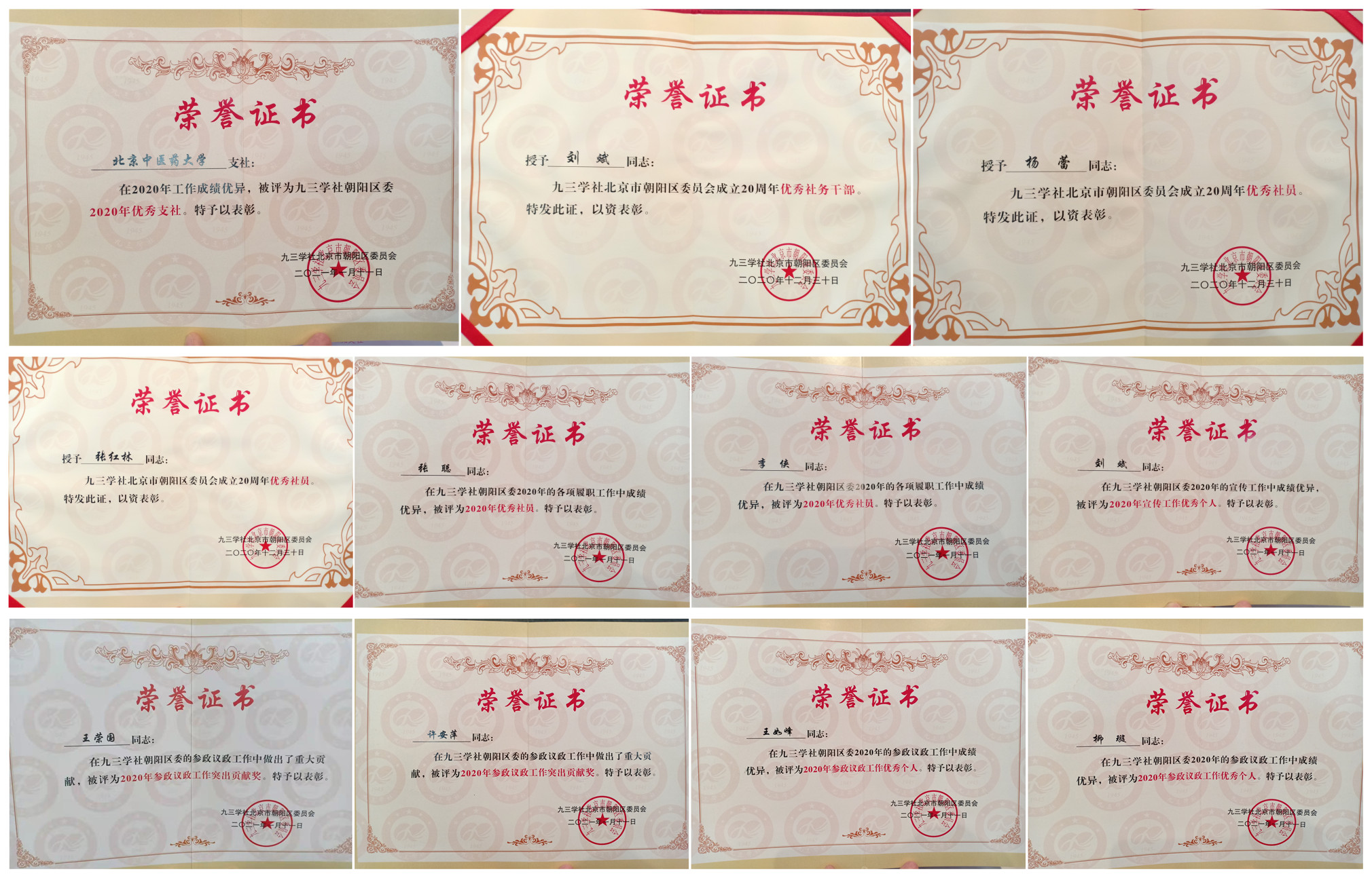 近期,在九三学社朝阳区委召开的区委全委扩大会议上,九三学社朝阳区委对于2020年度优秀支社和优秀个人进行了表彰。九三学社世界杯竞猜平台支社被评为“九三学社朝阳区委2020年优秀支社”,刘斌被评为“九三学社朝阳区委成立20周年优秀社务干部”,杨蕾、张红林被评为“九三学社朝阳区委成立20周年优秀社员”,张聪、李侠被评为“2020年优秀社员”,刘斌被评为“2020年宣传工作优秀个人”,王荣国、许安萍获“2020年参政议政工作突出贡献奖”,王如峰、柳璇被评为“2020年参政议政工作优秀个人”。