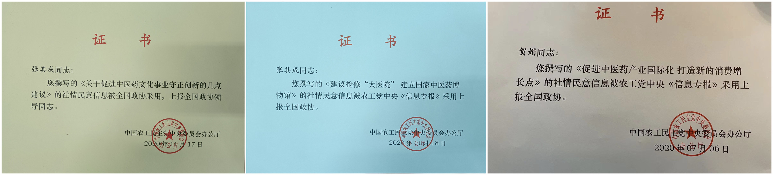 近日,我校农工党支部陆续收到中国农工民主党中央委员会办公厅颁发的证书。其中,张其成教授撰写的《建议抢修“太医院”建立国家中医药博物馆》、《关于促进中医药文化事业守正创新的几点建议》及贺娟教授撰写的《促进中医药产业国际化 打造新的消费增长点》等社情民意信息均被农工党中央《信息专报》采用,并上报全国政协。