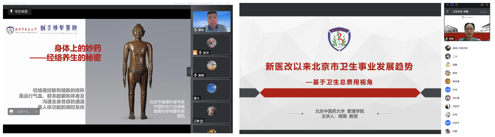 在主题交流环节,我校知联会会长程凯教授、副会长程薇教授分别从经络腧穴领域和医疗政策领域进行了主题分享。程凯教授分享的《通畅身体母亲河 经络养生的秘密》介绍了从人类文明逐渐建立到各大文明古国发展过程中穴位疗法的应用,并详细讲解了“躯体—内脏—交感神经反射系统”等关于经络系统的现代认识。程薇教授分享的《新医改以来北京市卫生事业发展趋势 基于卫生总费用视角》介绍了我国新医改背景、卫生总费及应用、北京市卫生事业发展趋势。北京“新医改”降低了医用设备检查项目价格,提升了医疗服务项目价格,取消医用耗材加成,改善医疗服务增强了群众获得感。