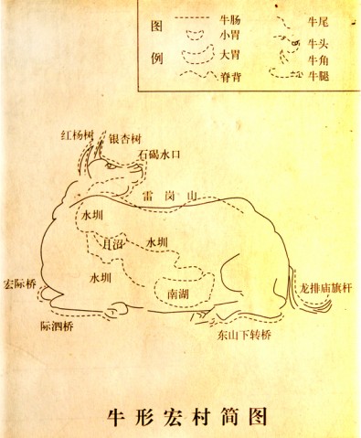 古徽州建筑由于山多地少等地形、地貌的影响,同时人口稠密,所以在建筑规划和布局上更为多样和灵活,或依山傍水,或依林而建,注重风水之学。村落大多尽力符合“枕山、环水、面屏”这一按风水理论属于理想村落的环境并建造。而且古徽州的村落整体布局往往着意模仿一些有内涵的图案,反映村民的某种心理趋向,体现出强烈的心理追求和精神象征意义[4]。譬如黟县西递,明清时期为商贾聚集之地,整个村落模拟船的造型,村头七哲祠象征“眺台”,旁有大树象征桅杆,祈求亲人在外行商一帆风顺。而黟县宏村呈现牛形布局,村子不同部位对应牛身不同位置,整个村落犹如一头牛静卧在绿水青山中,与自然和谐统一。(图3、图4)
