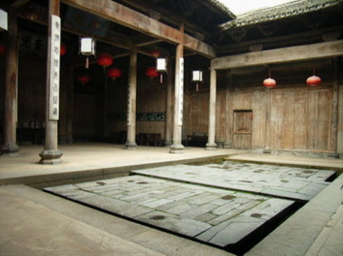 天井是古徽州建筑的一大特色,具有承接和排除屋面流水、采光、通风的作用。由于屋面檐口内朝天井,四周流水从檐口流入明坑,当地称之为“四水归堂”,由于水主财,当地徽商非常重视,要“聚财气”,“肥水不流外人田”,所以这种建筑设计正是该种想法在建筑上的外化。此外,天井长宽比一般为5:1,狭长形天井的采光多为二次折射光,相比较自然光更为柔和,使人感觉静谧舒适。由于天井狭小,风沙尘埃干扰亦小,厅堂与天井之间很少设门,两者通常融为一体,人们坐在厅堂内就能够晨沐朝阳,夜观星斗。高大封闭的外墙隔离了自然,但天井又将自然引入,这正是古徽州的建筑风格的具体体现。(图8、图9)